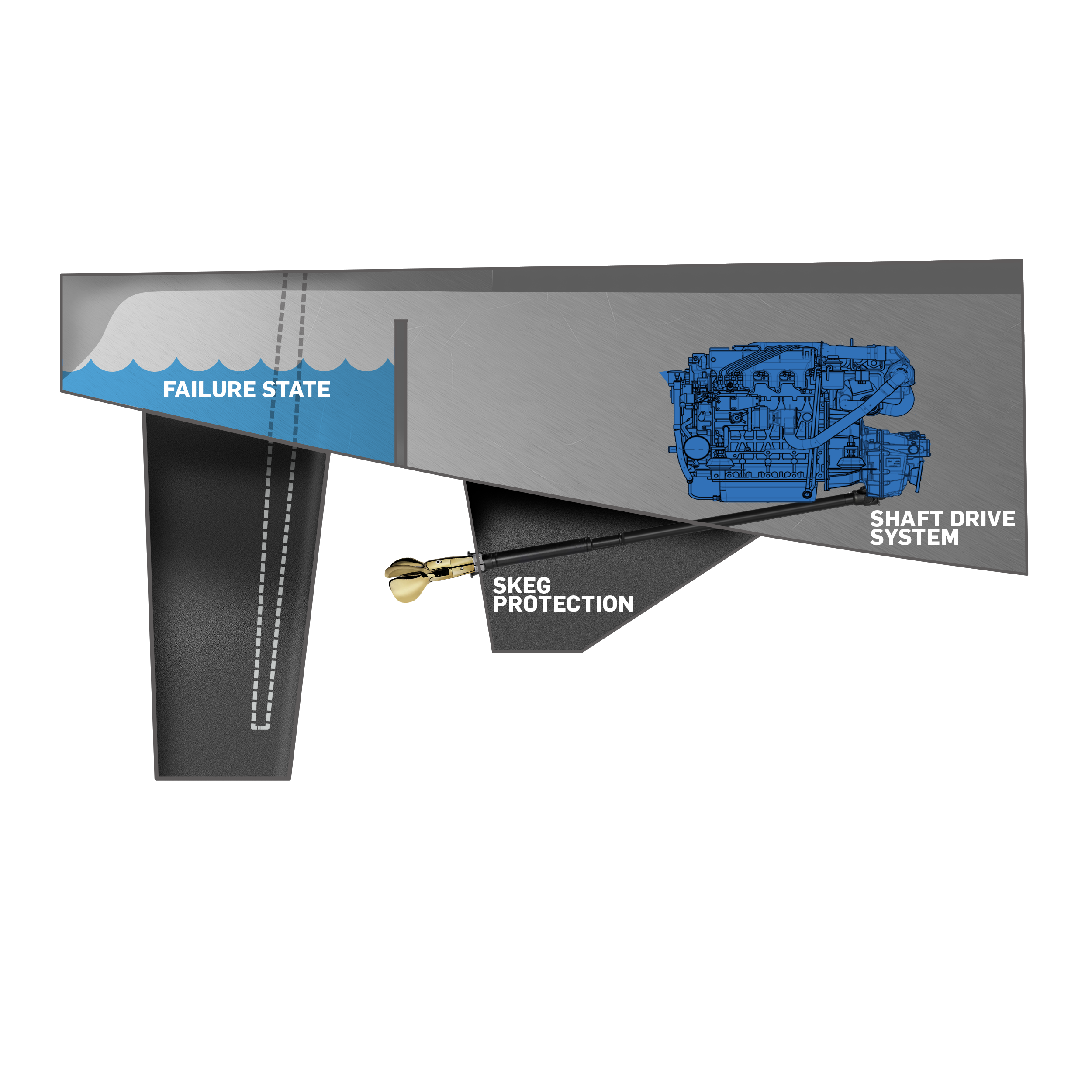 If the rudder post is compromised in a collision, water ingress on most boats is unchecked. On the Nahoa M, a partial structural frame sits immediately forward of the rudder post — above the waterline — containing any flooding to the aft engine space and preventing progressive ingress into the rest of the vessel.