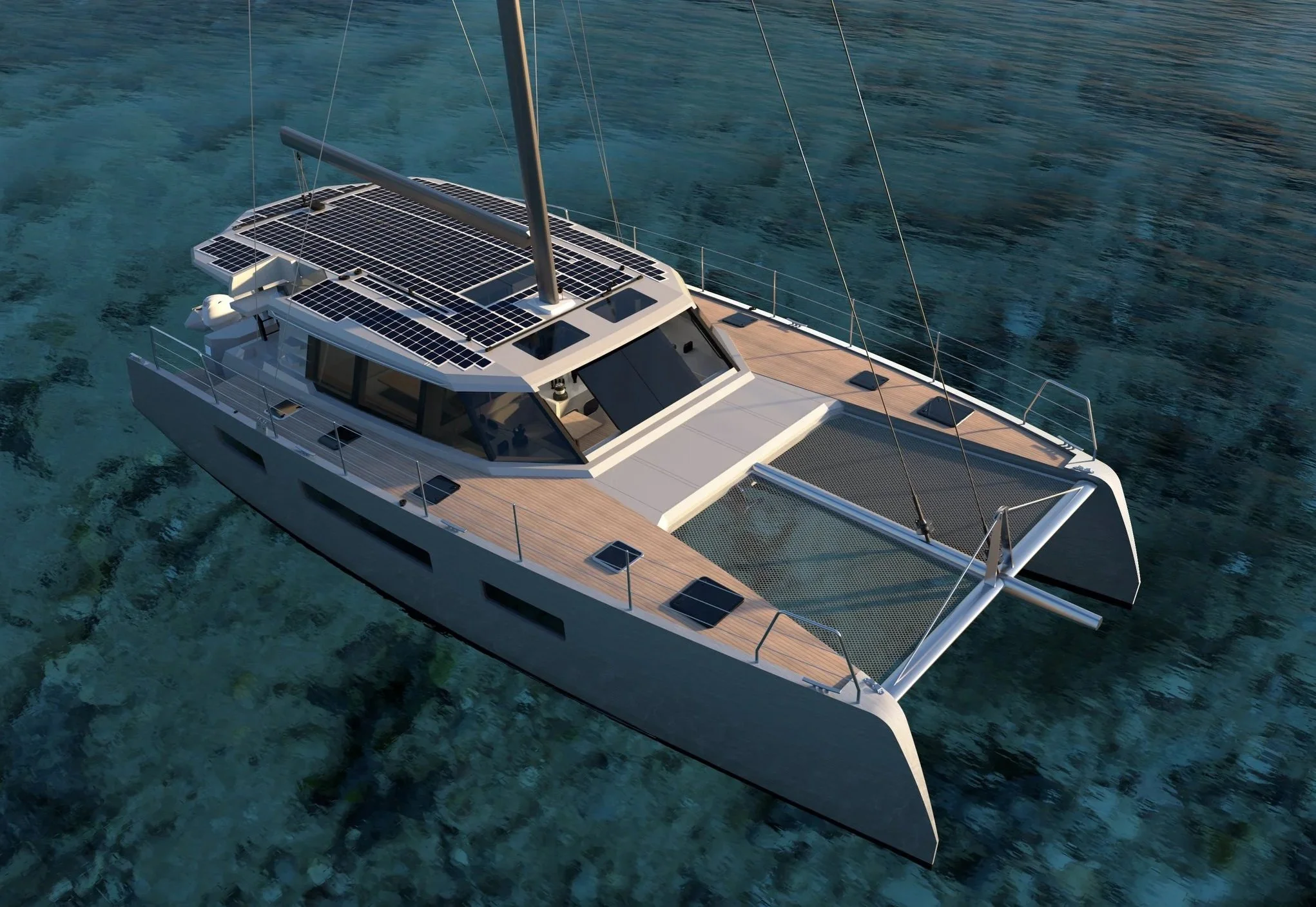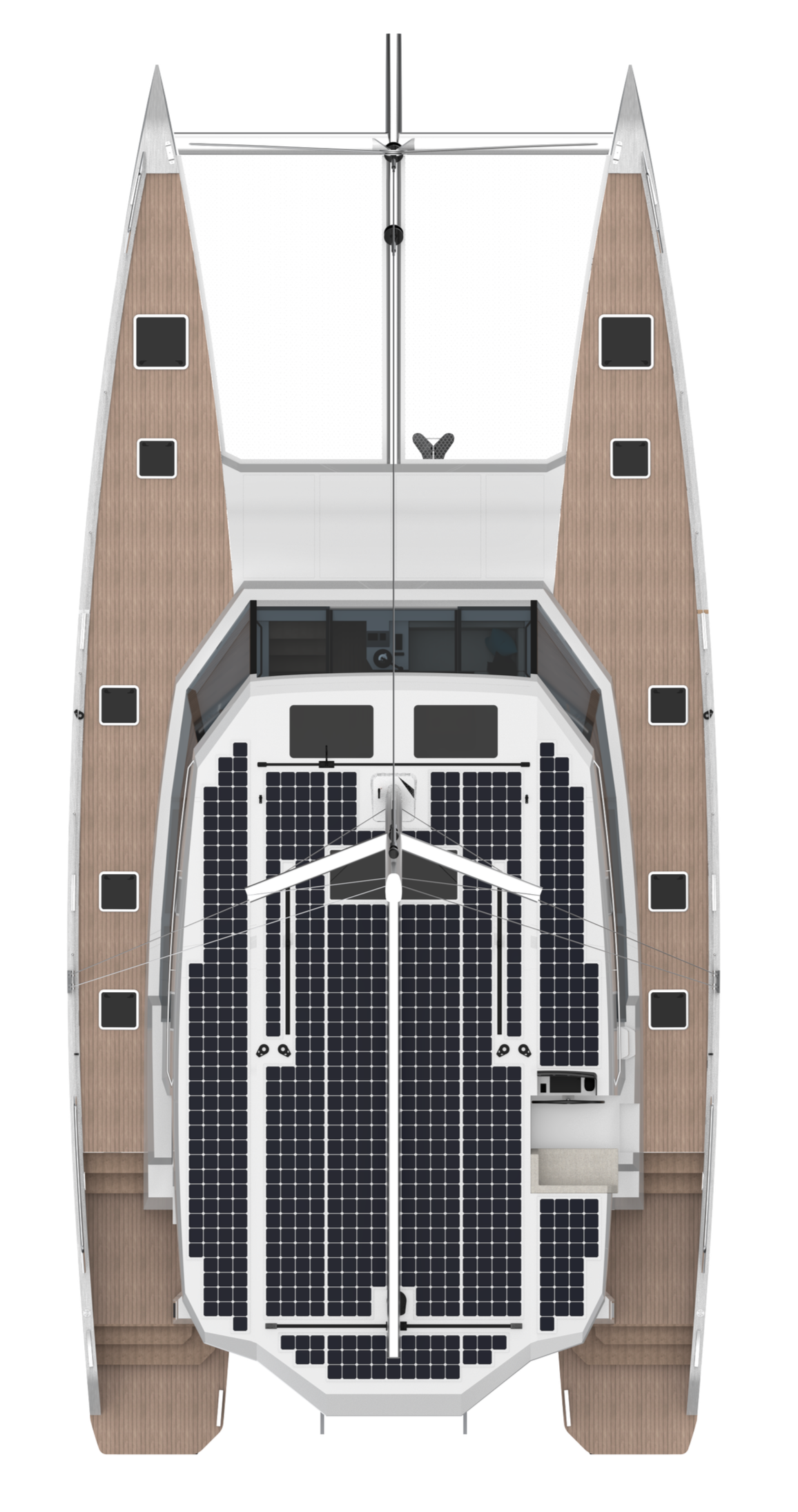 The interior volume is deliberately restrained to that of a cruising 48-foot catamaran, keeping systems compact, accessible, and easy to live with over time. The rig is sized and loaded like a 52 — manageable by a short-handed crew, predictable in squalls, and conservative in its loads.